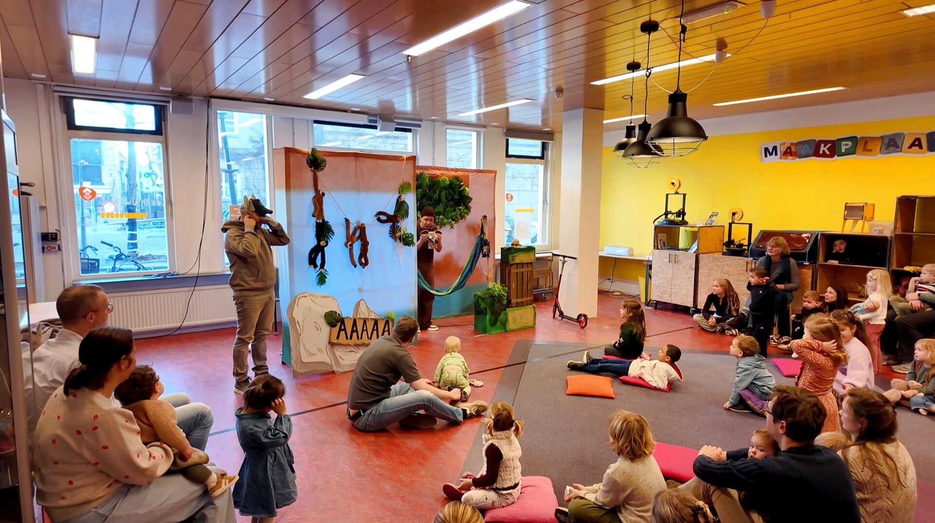 De voorstelling werd druk bezocht. Veel kinderen, van klein tot nóg kleiner, kwamen samen met hun (groot)ouders naar de bibliotheek. Het werd al snel een dolle boel, vooral toen een van de papa’s werd uitgerust met een slurf om de rol van olifant te spelen. De tijdelijke olifant moest braaf doen wat de verteller hem opdroeg, wat tot grote hilariteit leidde bij het jonge publiek. Ook werden zowel kinderen als ouders enthousiast aan het dansen en springen gekregen. De voorstelling tijdens deze Voorleesweek bleek een groot succes. Na afloop kregen de kinderen ook allemaal nog een knuffelaapje mee.