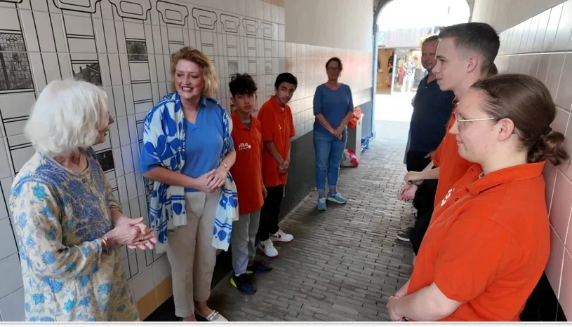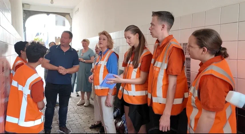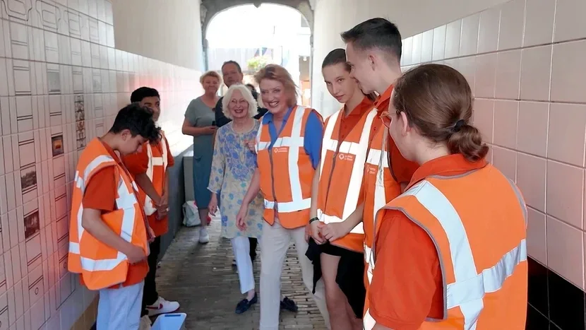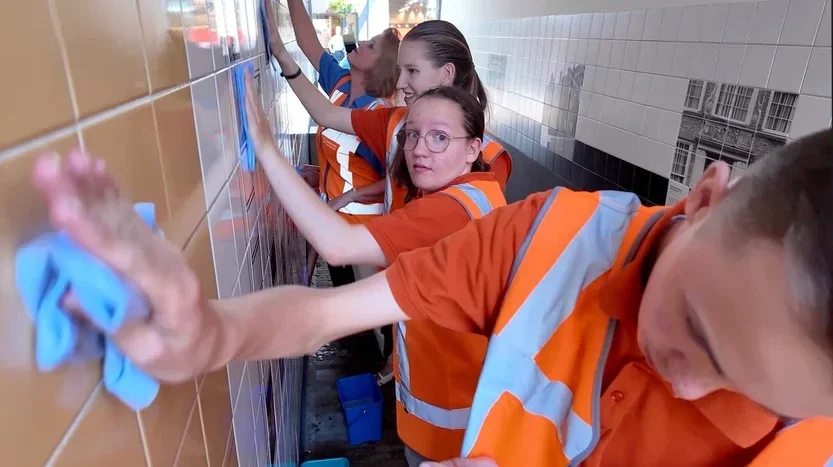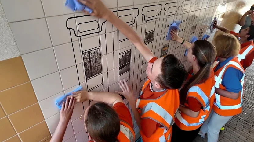 Het kunstwerk “Automatiek”, een prachtig wit tegelplateau, was in de loop der jaren behoorlijk vervuild geraakt. Om deze historische herinnering weer in ere te herstellen, reikte burgemeester Reinie Melissant schoonmaakspullen uit aan de leerlingen, zodat zij aan de schoonmaak konden beginnen. Gewapend met schoonmaakmiddelen en gekleed in opvallende oranje vesten. De burgemeester gaf het goede voorbeeld door zelf ook mee te poetsen.