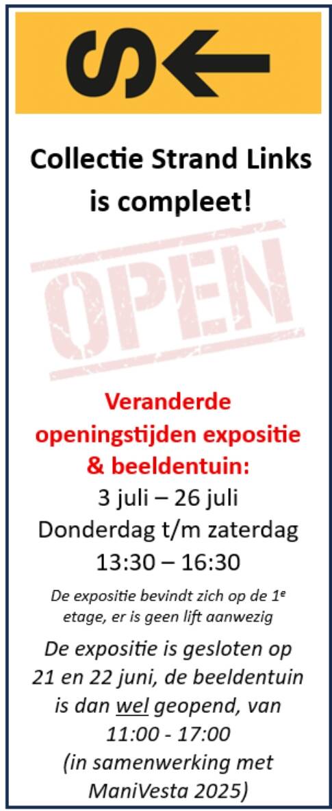 De expositie in de Affuitloods is nog te bezichtigen tot en met 26 juli, elke donderdag, vrijdag en zaterdag van 13:30 tot 16:30 uur. Ook de beeldentuin met twintig kunstwerken is dan geopend voor publiek.