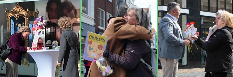 Maar er was nog veel meer te beleven. Vrolijke dames deelden bloemen uit, boden een knuffel aan iedereen die daar zin in had, en zorgden samen met vrijwilligers voor smakelijke hapjes. Het leverde een gemoedelijke sfeer op in de binnenstad, waarin mensen even de tijd namen voor elkaar.