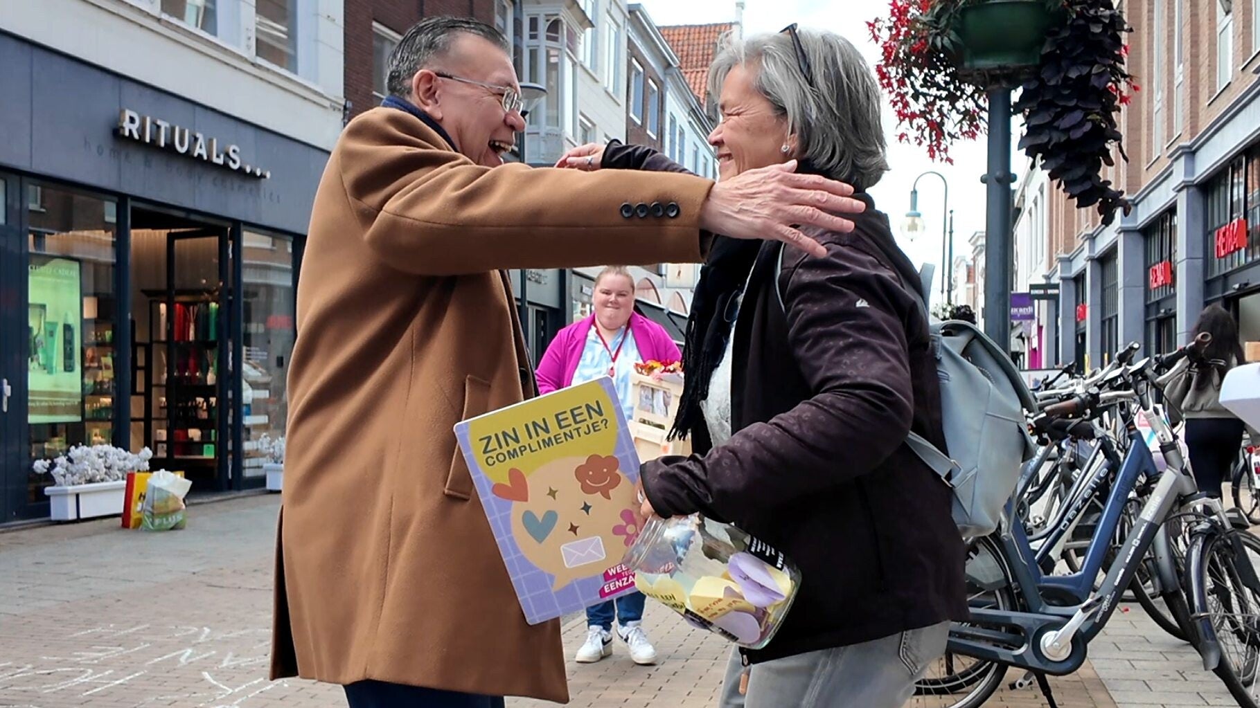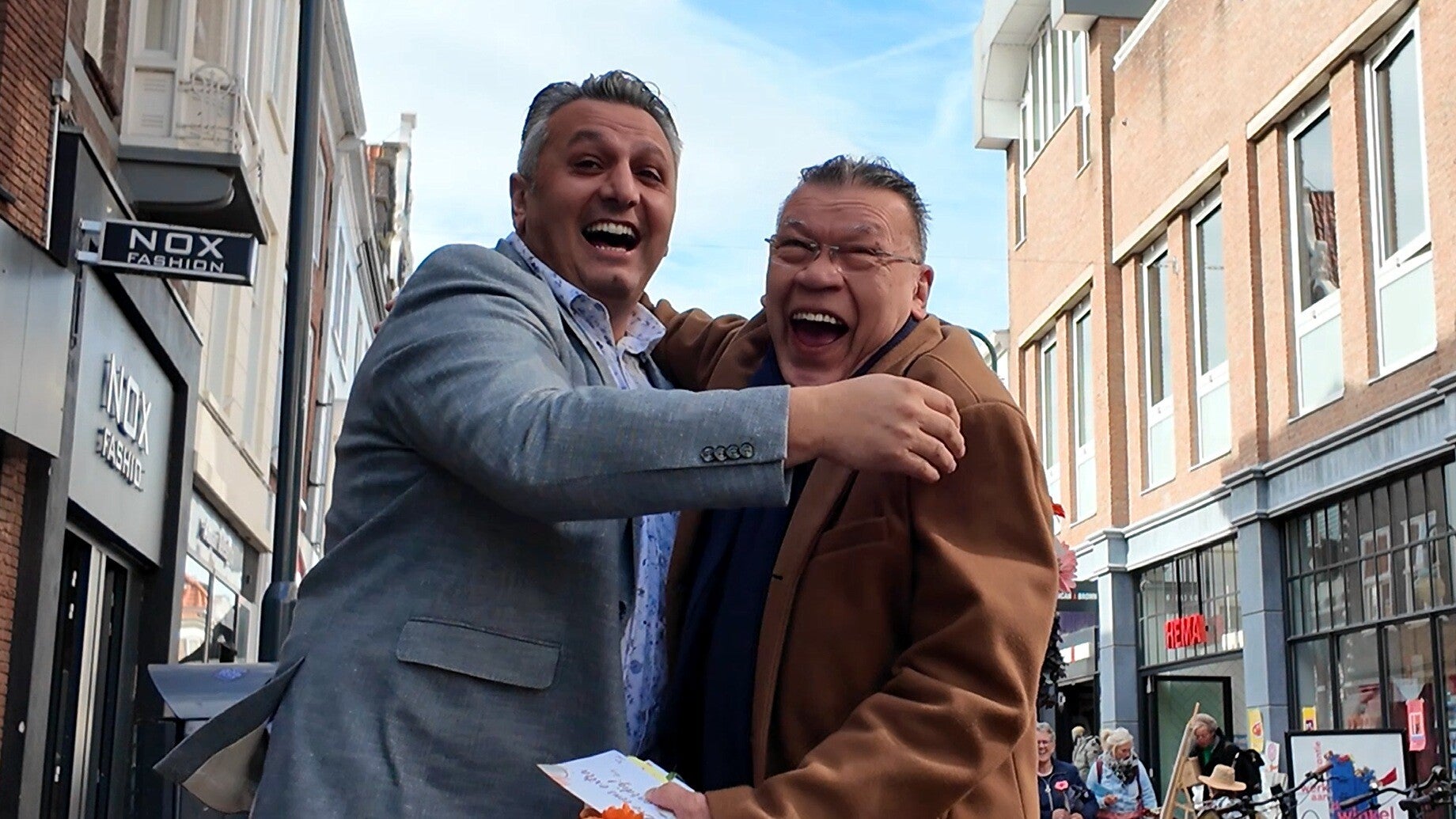 Ook wethouder Fatih Polatli liep enthousiast door de stad. Met een brede glimlach deelde hij bloemen uit en nam natuurlijk zelf ook een knuffel in ontvangst. Niemand minder dan Roy Grünewald, voor velen een bekende verschijning in Gorinchem, werd extra in het zonnetje gezet. Hij was die dag jarig en kon de vele knuffels niet ontlopen – zelfs de wethouder gaf hem een welgemeende omhelzing. Roy’s verjaardag kreeg hierdoor een onvergetelijk tintje.
