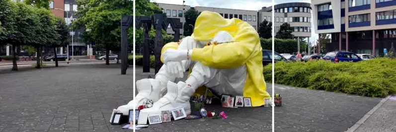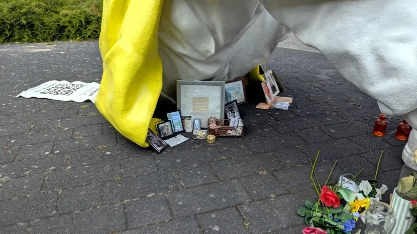 Het beeld, net geplaatst en omgeven door foto's, bloemen en knuffels, trekt voortdurend voorbijgangers. De fotograaf moet geduldig wachten om een foto te maken, aangezien niet iedereen gefotografeerd wil worden.