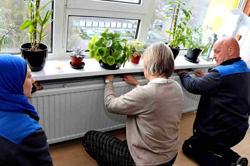 Wethouder Molengraaf (midden) plaatst samen met FIXbrigade voorvrouw Iman (links) en klusser Bert (rechts) radiatorfolie achter een radiator in een woning in Gorinchem
