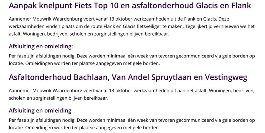Per fase zijn er afsluitingen nodig — begrijpelijk. En die worden keurig een week van tevoren aangekondigd via gele borden. Geel is tenslotte de kleur van waakzaamheid én bananen, dus dat valt op. Alleen… de borden lijken een eigen leven te leiden. Afgelopen week stonden ze op de Spijksedijk (de Flank) met de boodschap: 13-10 t/m 31-10 baanvak afgesloten. Deze week verdwenen ze daar als sneeuw voor de zon en doken op aan de Van Andel-Spruytlaan. En bij de Flank staat nu ineens een week later. Kortom: de borden spelen verstoppertje, maar wij zijn de klos.
