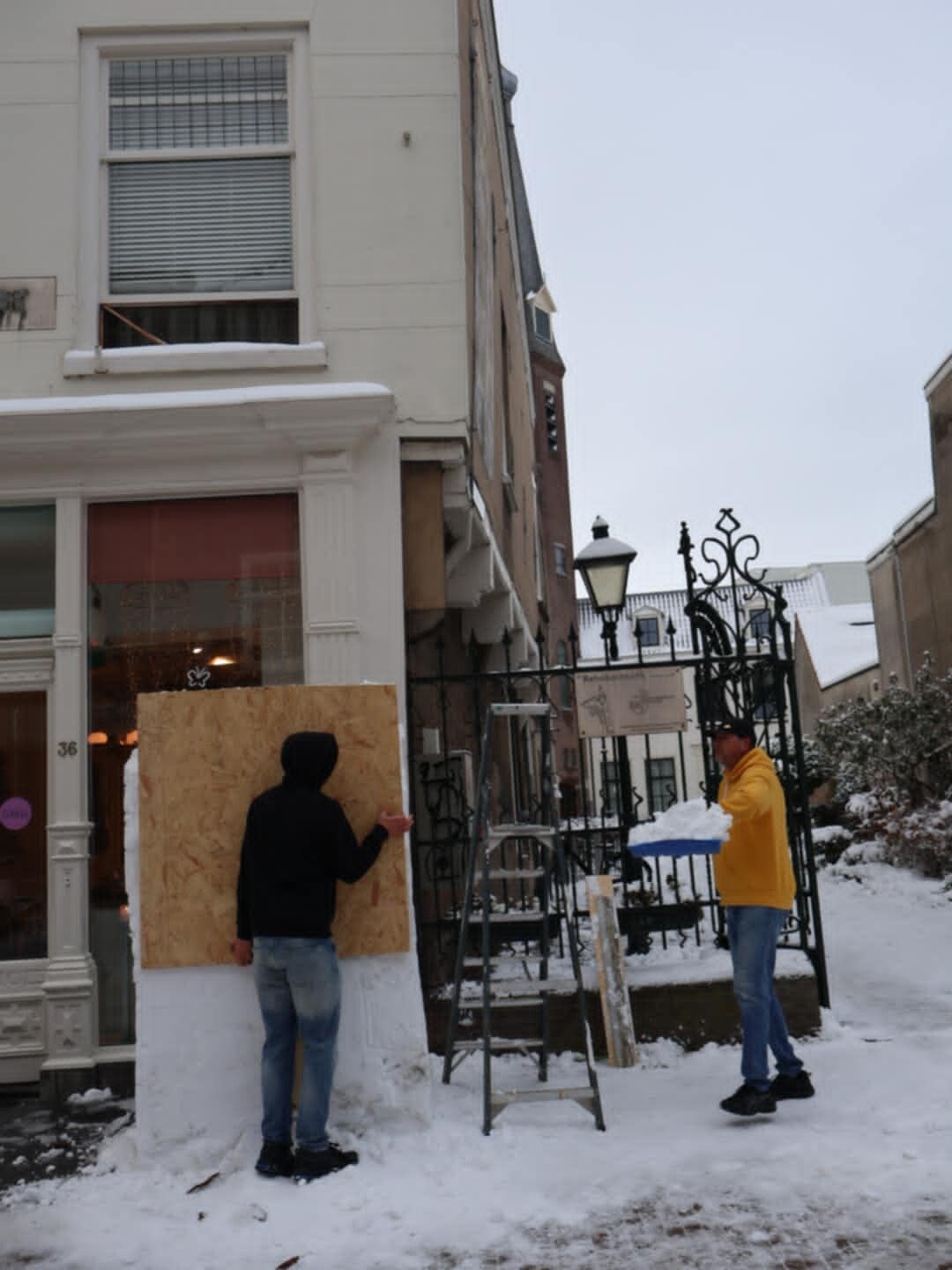 Vanochtend, tijdens zijn wandeling, zag fotograaf Michel de Ruiter iets bijzonders in de Gasthuisstraat. Bij lunchroom Jip was de eigenaar, Marko, al vroeg druk in de weer met sneeuw. Wat begon als wat gesjouw en geschep, bleek een paar uur later het begin van iets groots. Emmertje voor emmertje groeide er een gigantische sneeuwpop, steeds een stukje verder, steeds indrukwekkender.