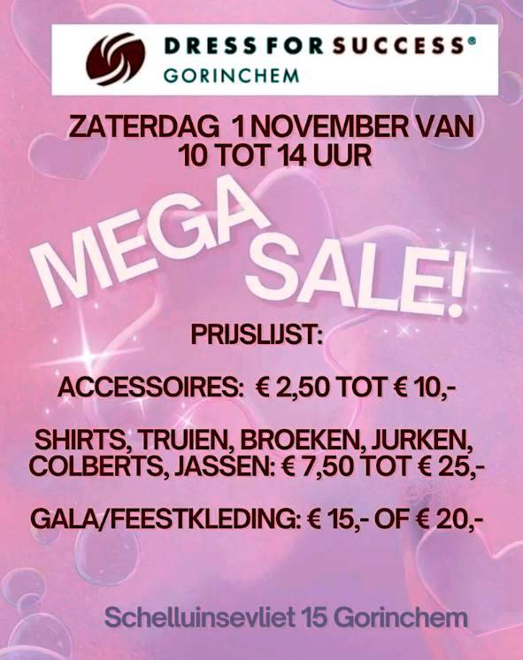 Op zaterdag 1 november houdt Dress for Success Gorinchem een eenmalige mega kledingsale – en dit keer mag je zonder afspraak langskomen! Tijdens deze speciale verkoopdag kun je prachtige dames- en herenkleding shoppen voor kleine prijzen. De opbrengst helpt ons om ook in de toekomst mensen te blijven ondersteunen bij hun sollicitatie en persoonlijke presentatie.