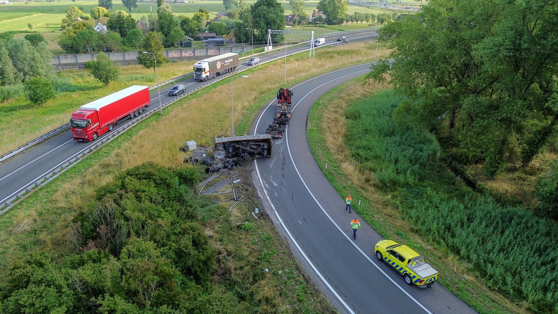 In een verbindingslus van de A15 naar de A27 op het knooppunt bij Gorinchem is donderdagochtend 17 juli 2025 een container met oud ijzer van een vrachtwagen gevallen.