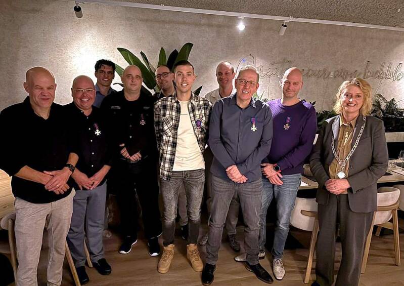 A. Rink, R. van Rijswijk, H. Schenau, O. Tulp en D. Thijs kregen een onderscheiding voor hun 12, 1/2-jarige jubileum. A. Tukker doet al 25 jaar mee en M. Kouvelt 30 jaar. Koploper blijft L. de Waal. Hij ontving een oorkonde en een medaille voor zijn 35 jaar trouwe dienst.