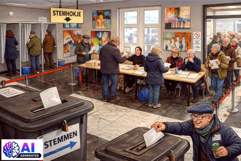 Zo hadden we het graag gezien in de hal van het museum tijdens het stemmen. Helaas betreft dit een met AI gegenereerd droombeeld. Van de kiesgerechtigden bracht iets meer dan de helft een bezoek aan de Gorcumse stembureaus.