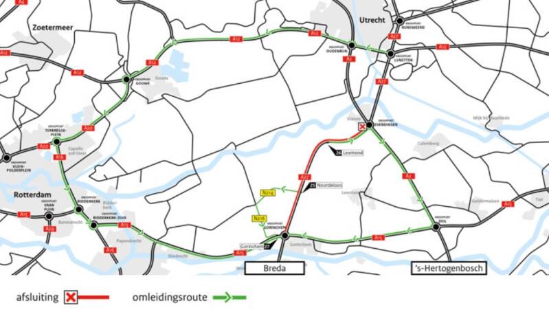 Om drukte op de omleidingsroutes te beperken, adviseert Rijkswaterstaat verkeer vanuit Utrecht om via Rotterdam te rijden. Lokaal verkeer wordt omgeleid via de N214 en N216. Gele borden geven de routes aan.